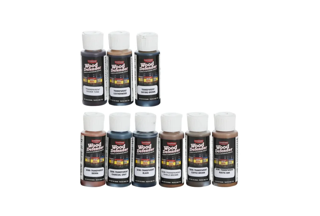 Our Wood Defender Starter Sample Kit includes 9 of our most popular colors: Transparent Cedar Tone, Leatherwood, Oxford Brown, and Semi-Transparent Rustic Oak, Coffee Brown, Sable Brown, Sierra, Charcoal Gray & Black.